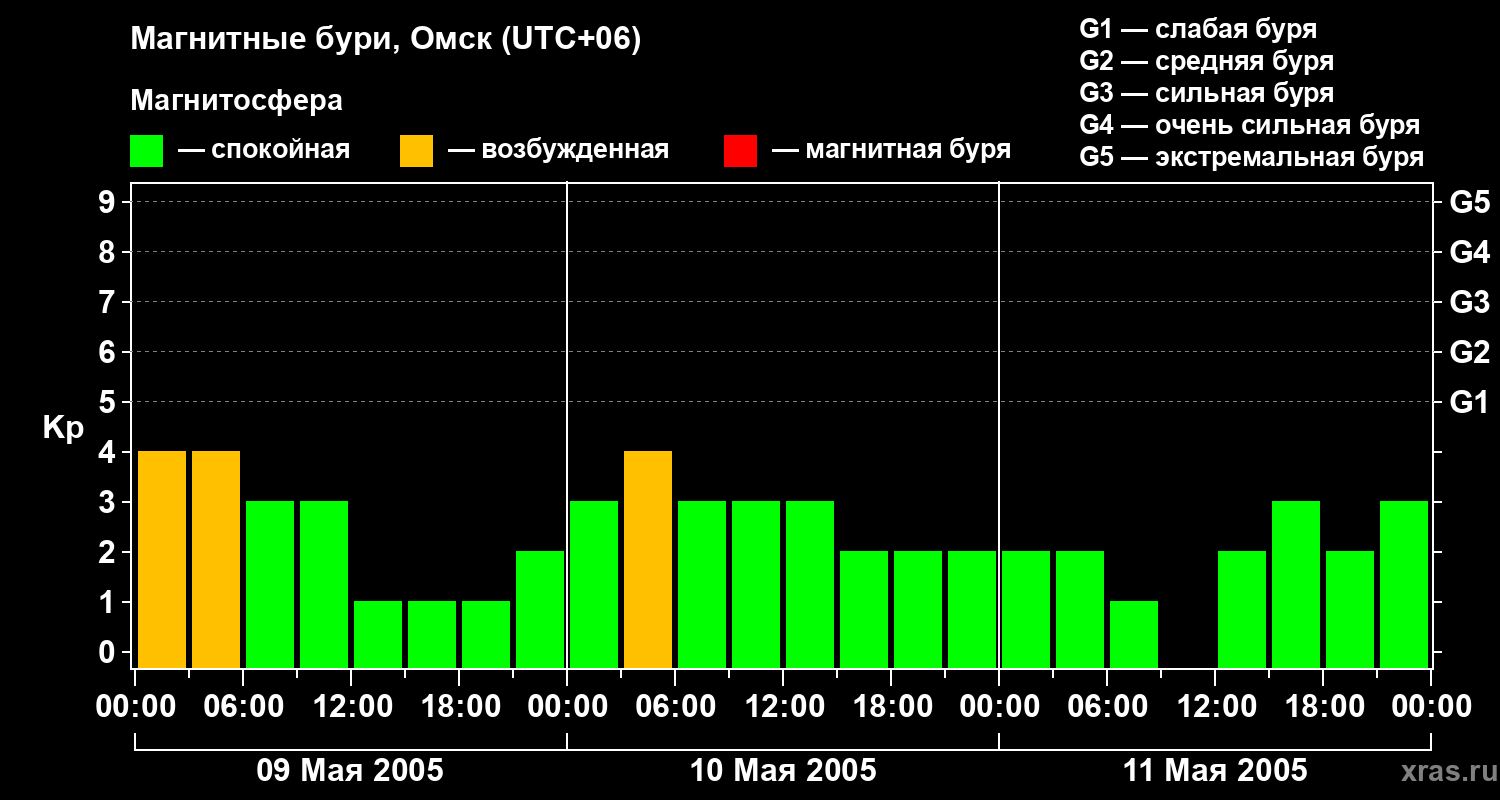Изменения геомагнитного индекса Kp с 9 по 11 мая 2005 года для средних широт