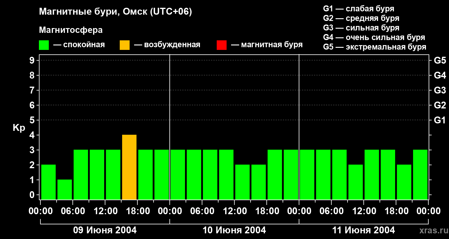 Изменения геомагнитного индекса Kp с 9 по 11 июня 2004 года для средних широт