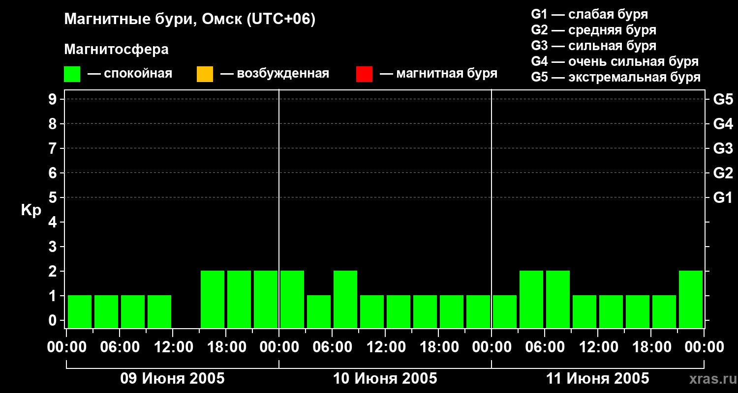 Изменения геомагнитного индекса Kp с 9 по 11 июня 2005 года для средних широт