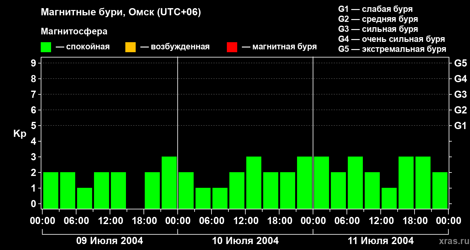 Изменения геомагнитного индекса Kp с 9 по 11 июля 2004 года для средних широт