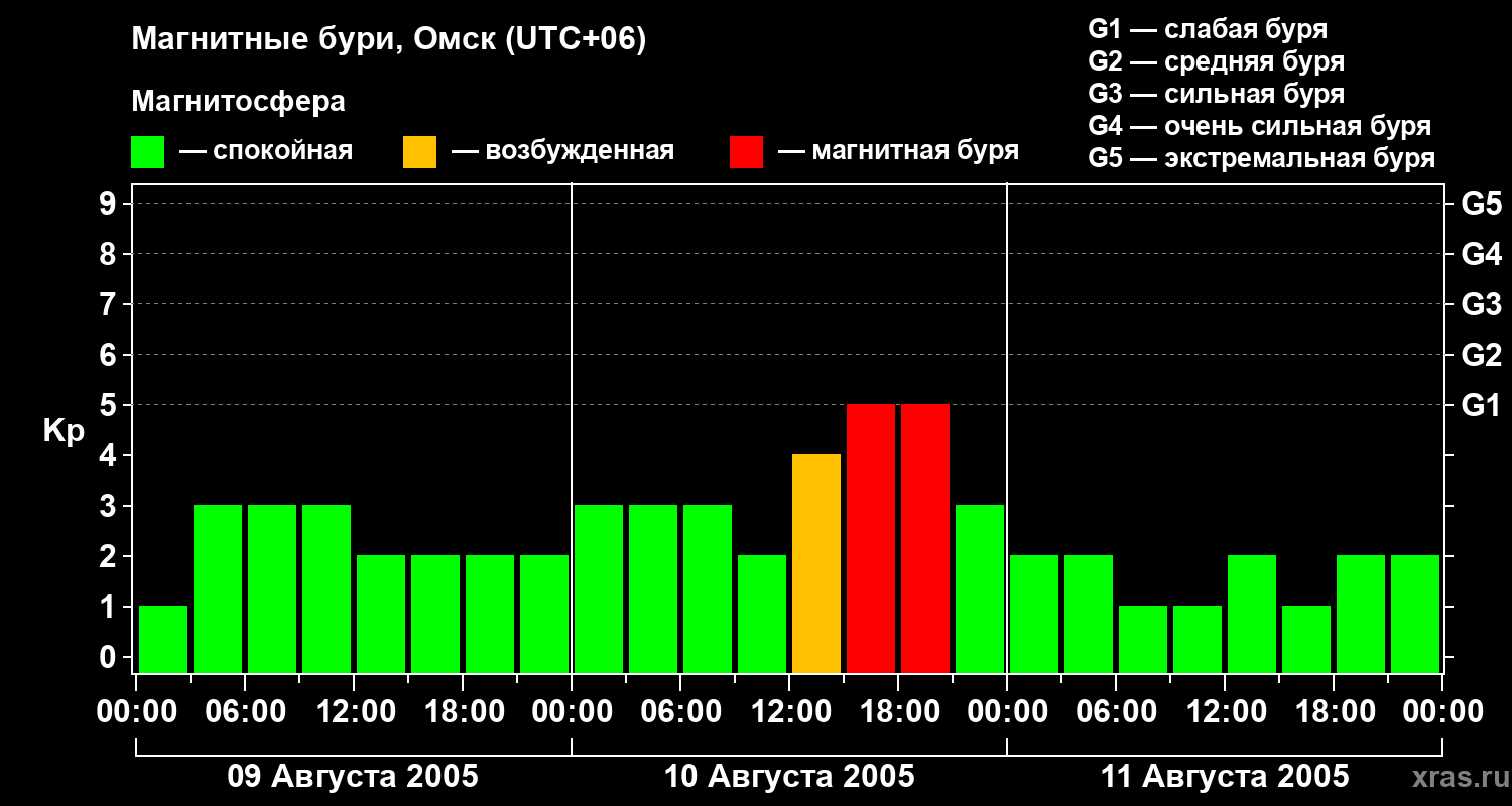 Изменения геомагнитного индекса Kp с 9 по 11 августа 2005 года для средних широт
