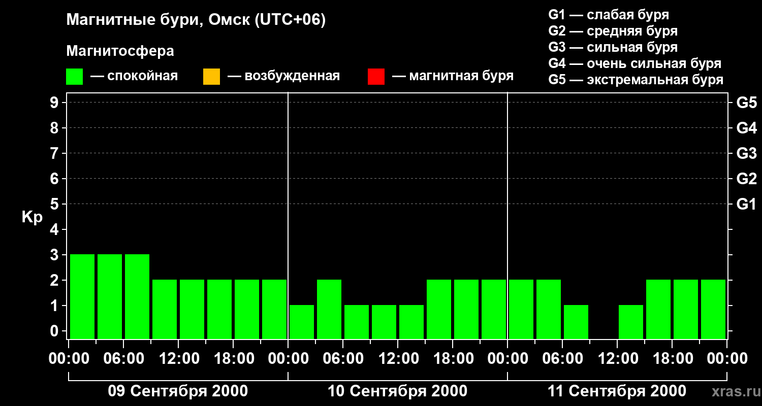 Изменения геомагнитного индекса Kp с 9 по 11 сентября 2000 года для средних широт