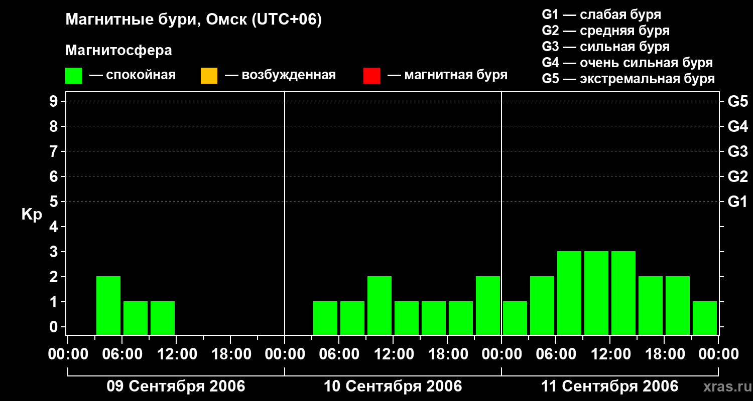 Изменения геомагнитного индекса Kp с 9 по 11 сентября 2006 года для средних широт