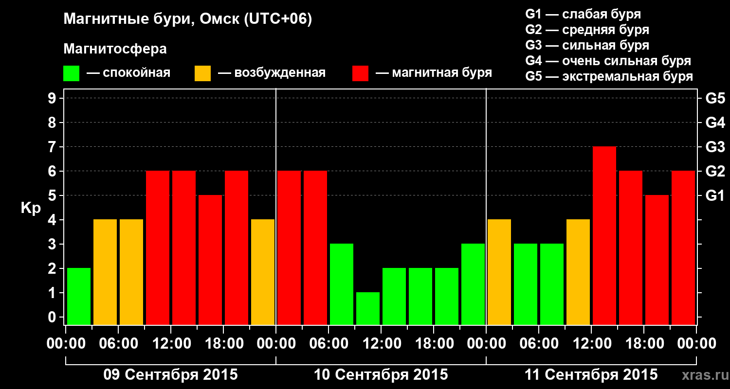 Изменения геомагнитного индекса Kp с 9 по 11 сентября 2015 года для средних широт
