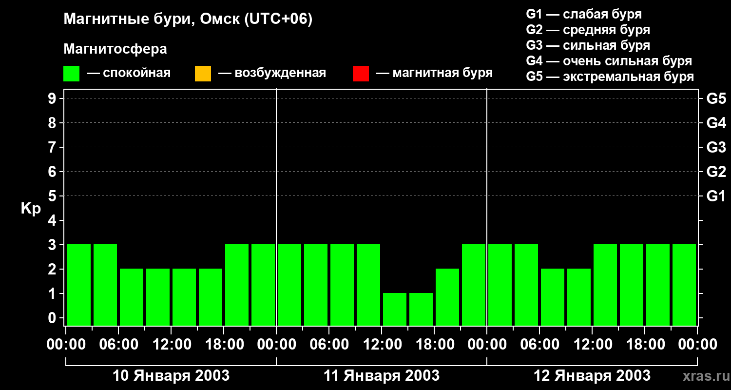 Изменения геомагнитного индекса Kp с 10 по 12 января 2003 года для средних широт