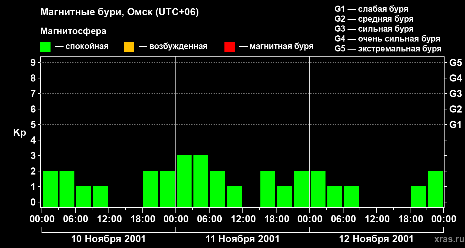 Изменения геомагнитного индекса Kp с 10 по 12 ноября 2001 года для средних широт