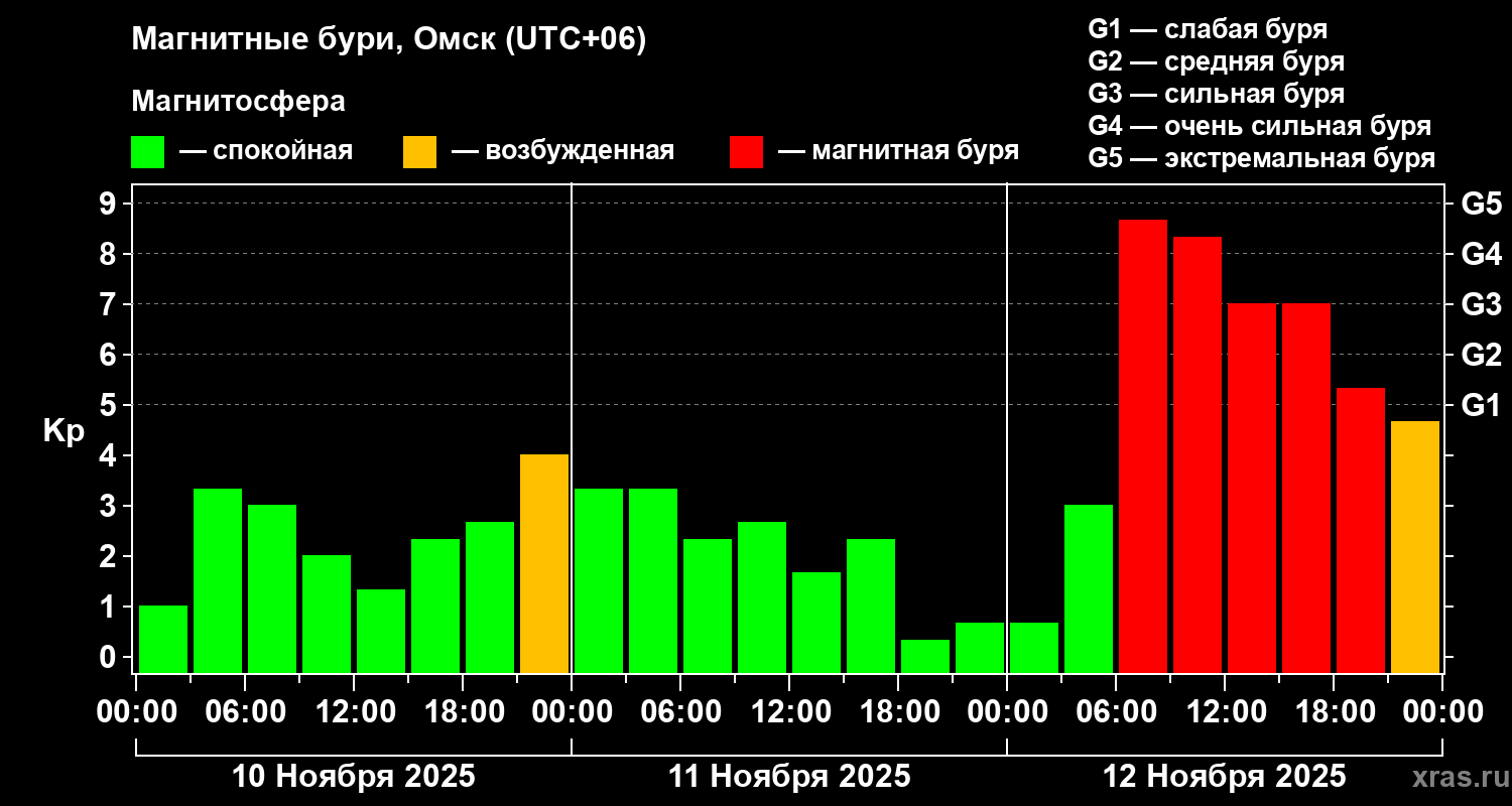 Изменения геомагнитного индекса Kp с 10 по 12 ноября 2025 года для средних широт