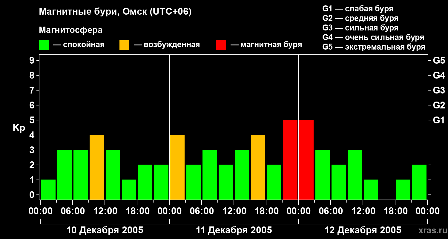 Изменения геомагнитного индекса Kp с 10 по 12 декабря 2005 года для средних широт