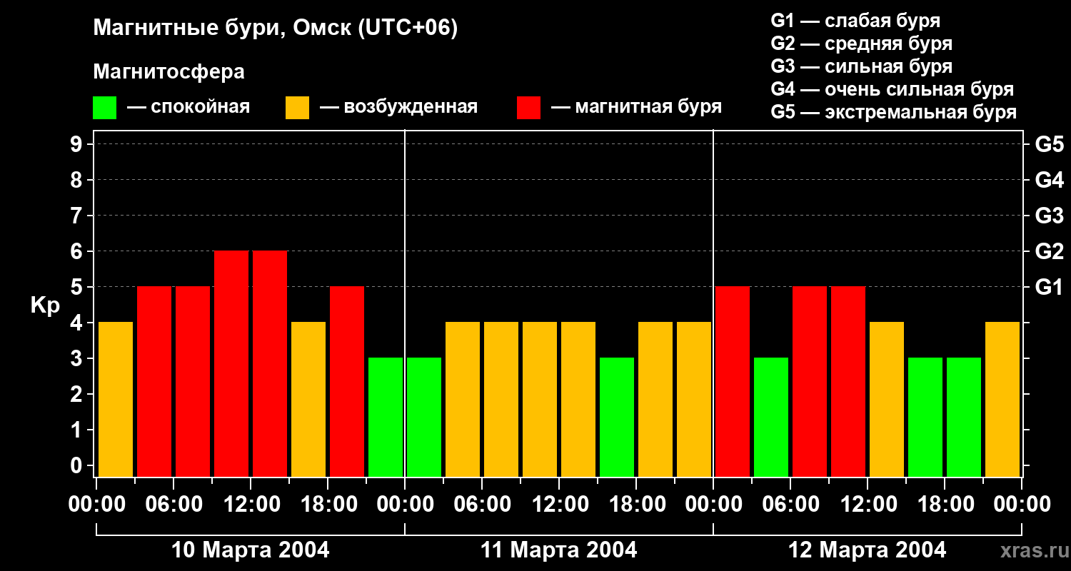 Изменения геомагнитного индекса Kp с 10 по 12 марта 2004 года для средних широт