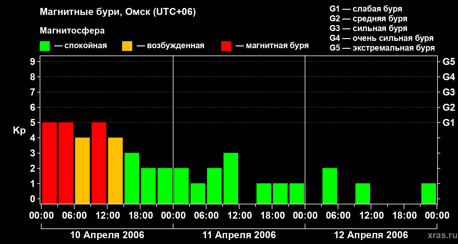 Изменения геомагнитного индекса Kp с 10 по 12 апреля 2006 года для средних широт
