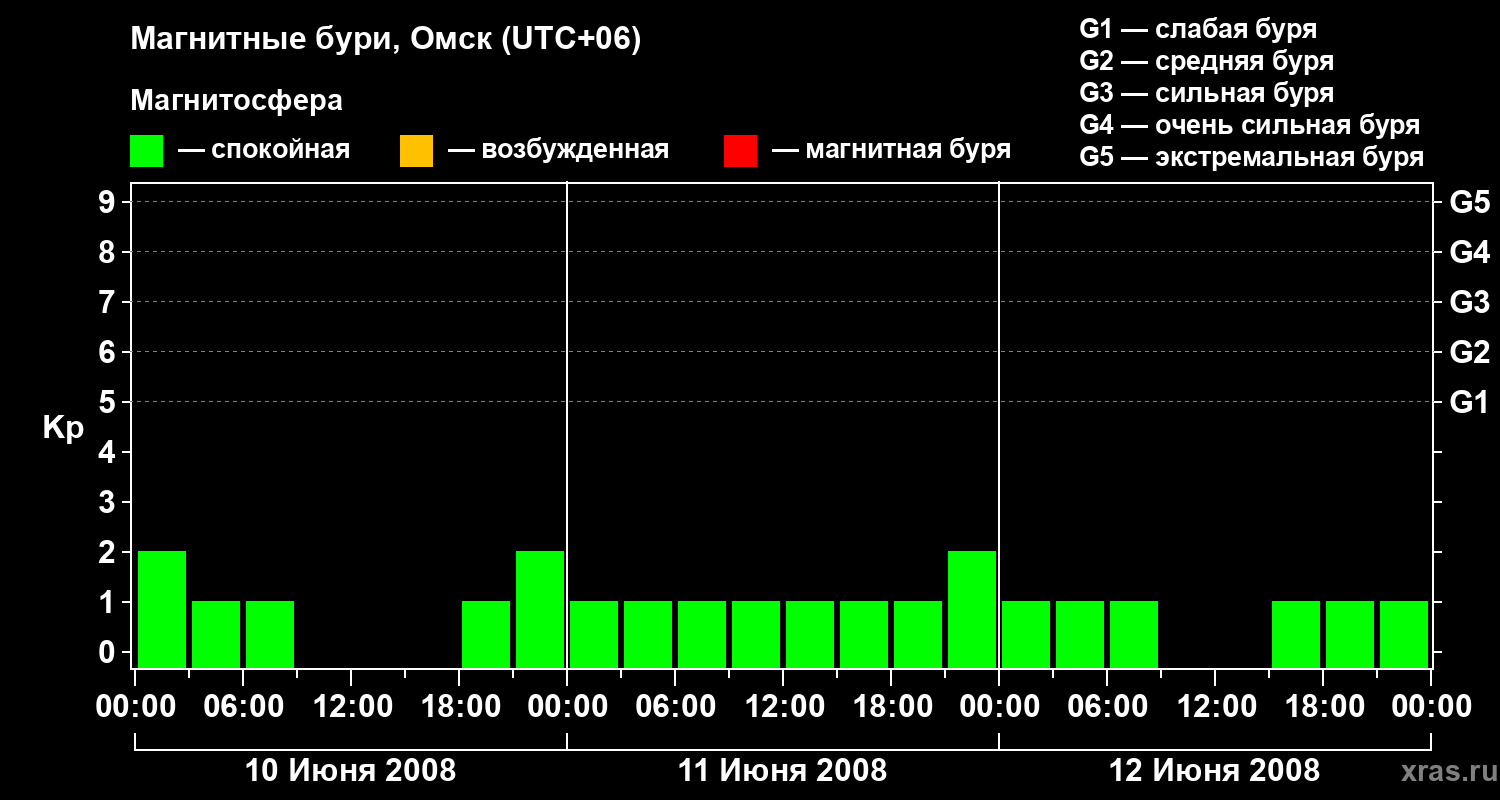 Изменения геомагнитного индекса Kp с 10 по 12 июня 2008 года для средних широт