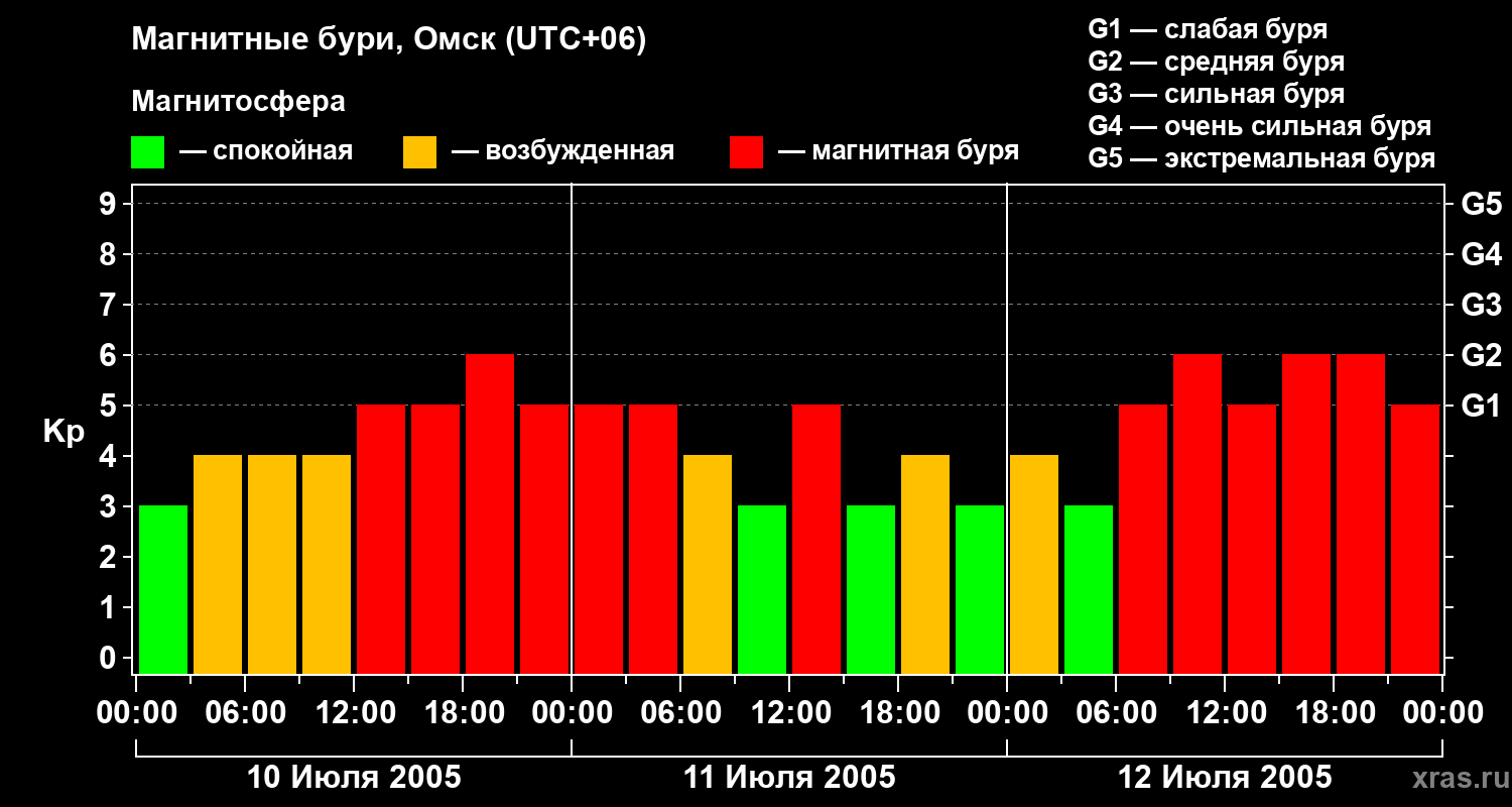 Изменения геомагнитного индекса Kp с 10 по 12 июля 2005 года для средних широт