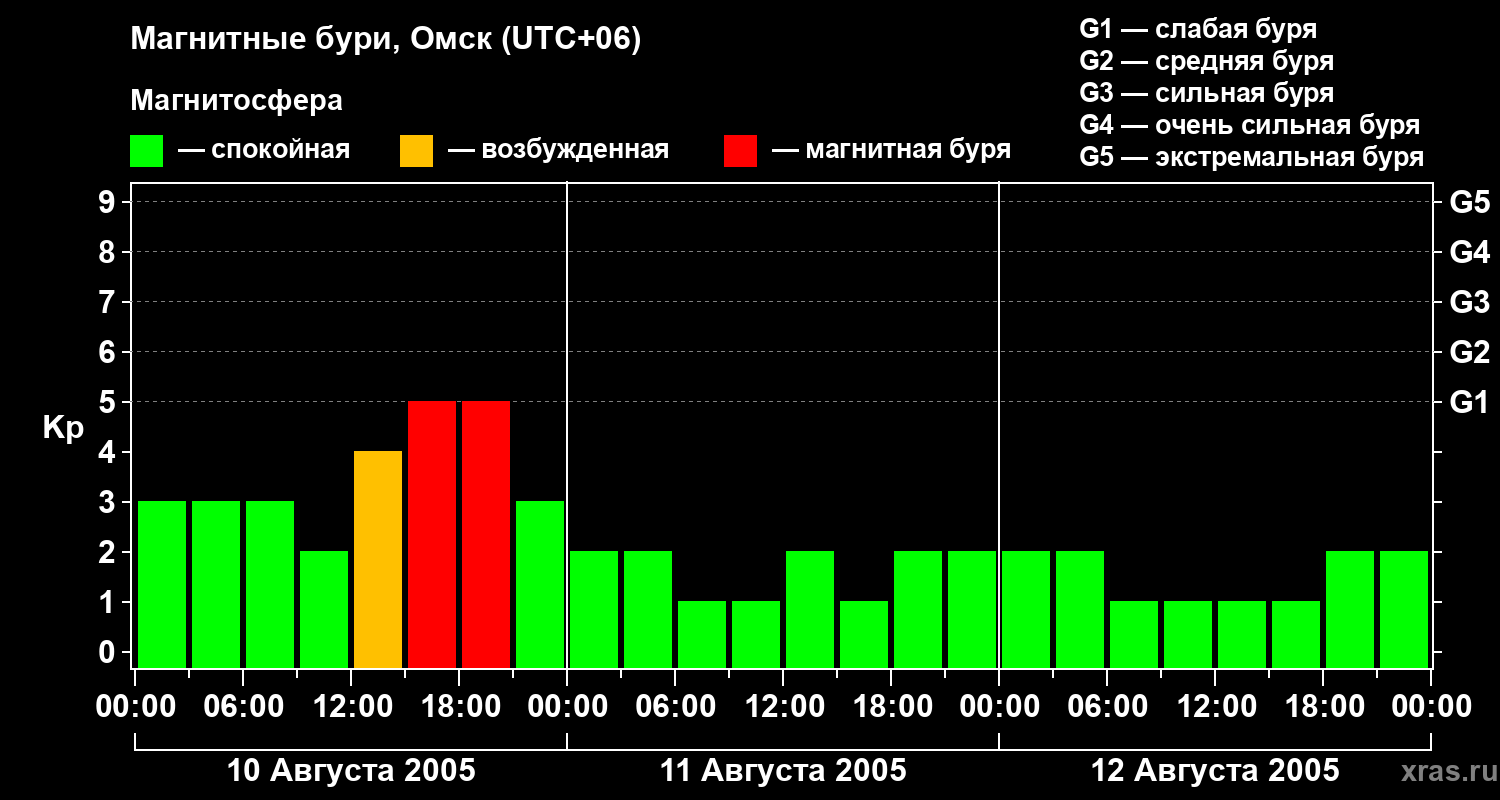 Изменения геомагнитного индекса Kp с 10 по 12 августа 2005 года для средних широт