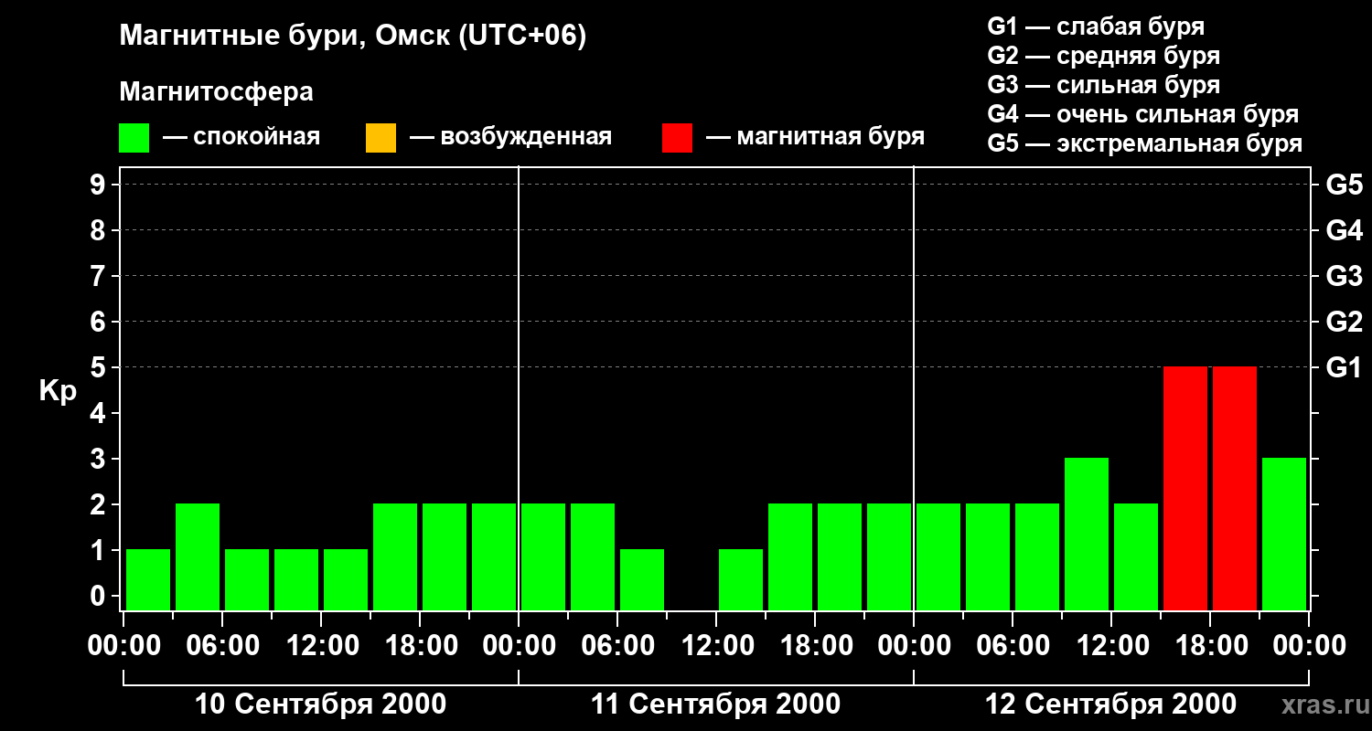 Изменения геомагнитного индекса Kp с 10 по 12 сентября 2000 года для средних широт