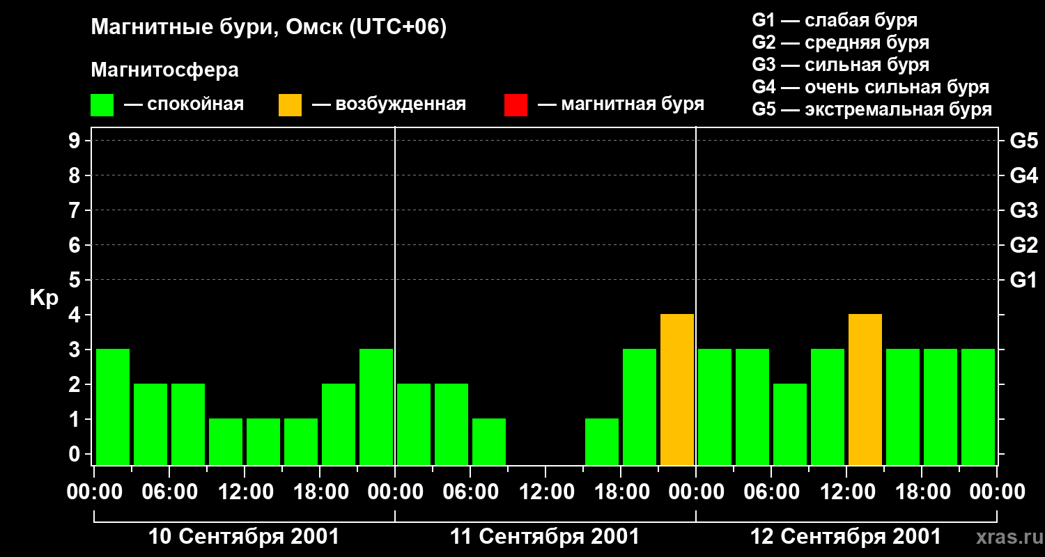 Изменения геомагнитного индекса Kp с 10 по 12 сентября 2001 года для средних широт