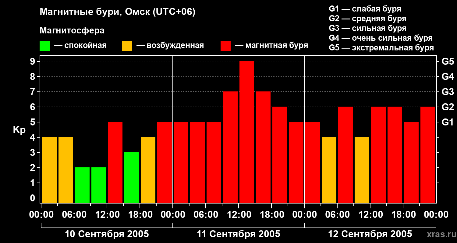 Изменения геомагнитного индекса Kp с 10 по 12 сентября 2005 года для средних широт