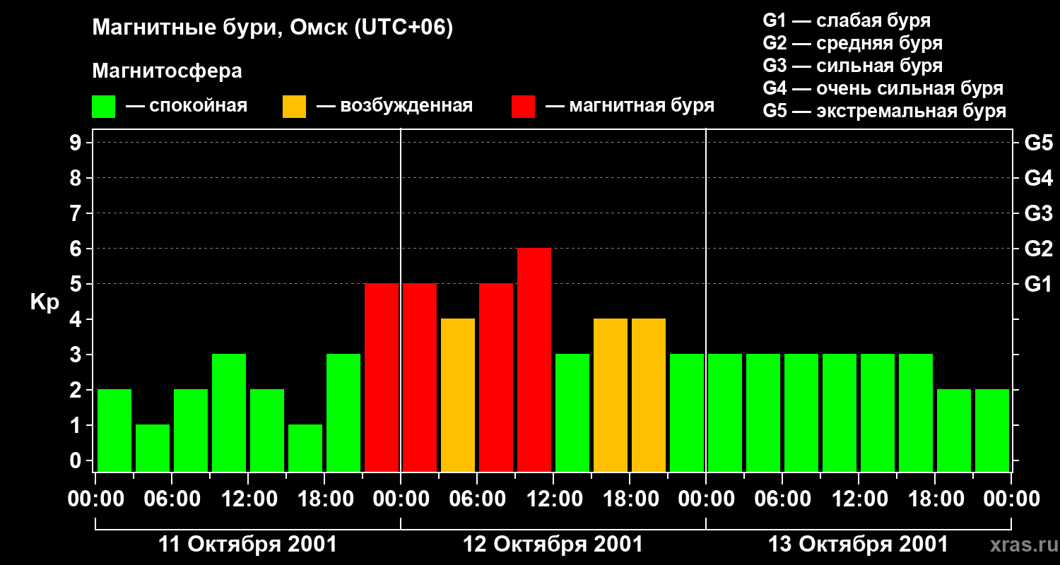 Изменения геомагнитного индекса Kp с 11 по 13 октября 2001 года для средних широт