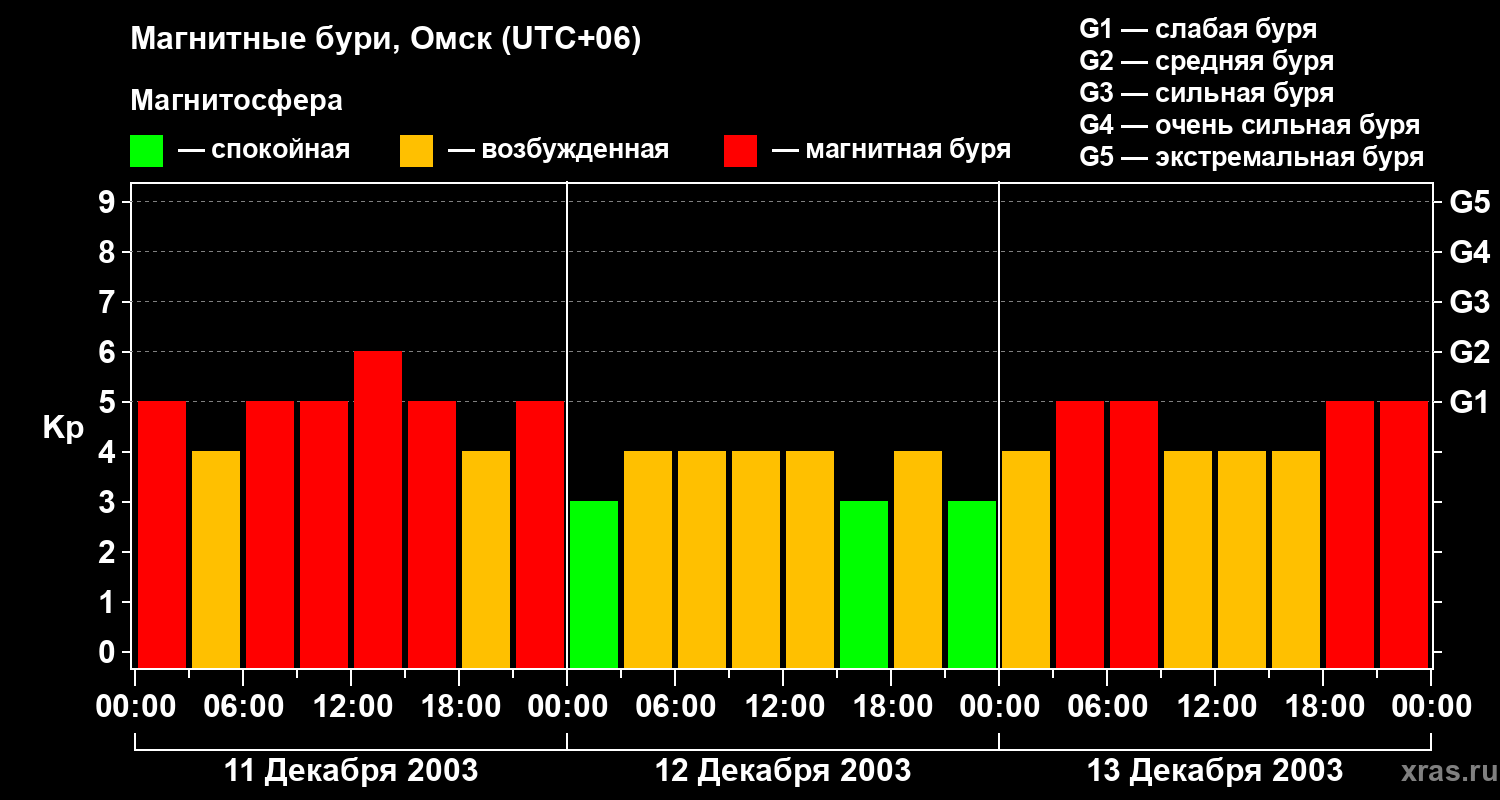 Изменения геомагнитного индекса Kp с 11 по 13 декабря 2003 года для средних широт