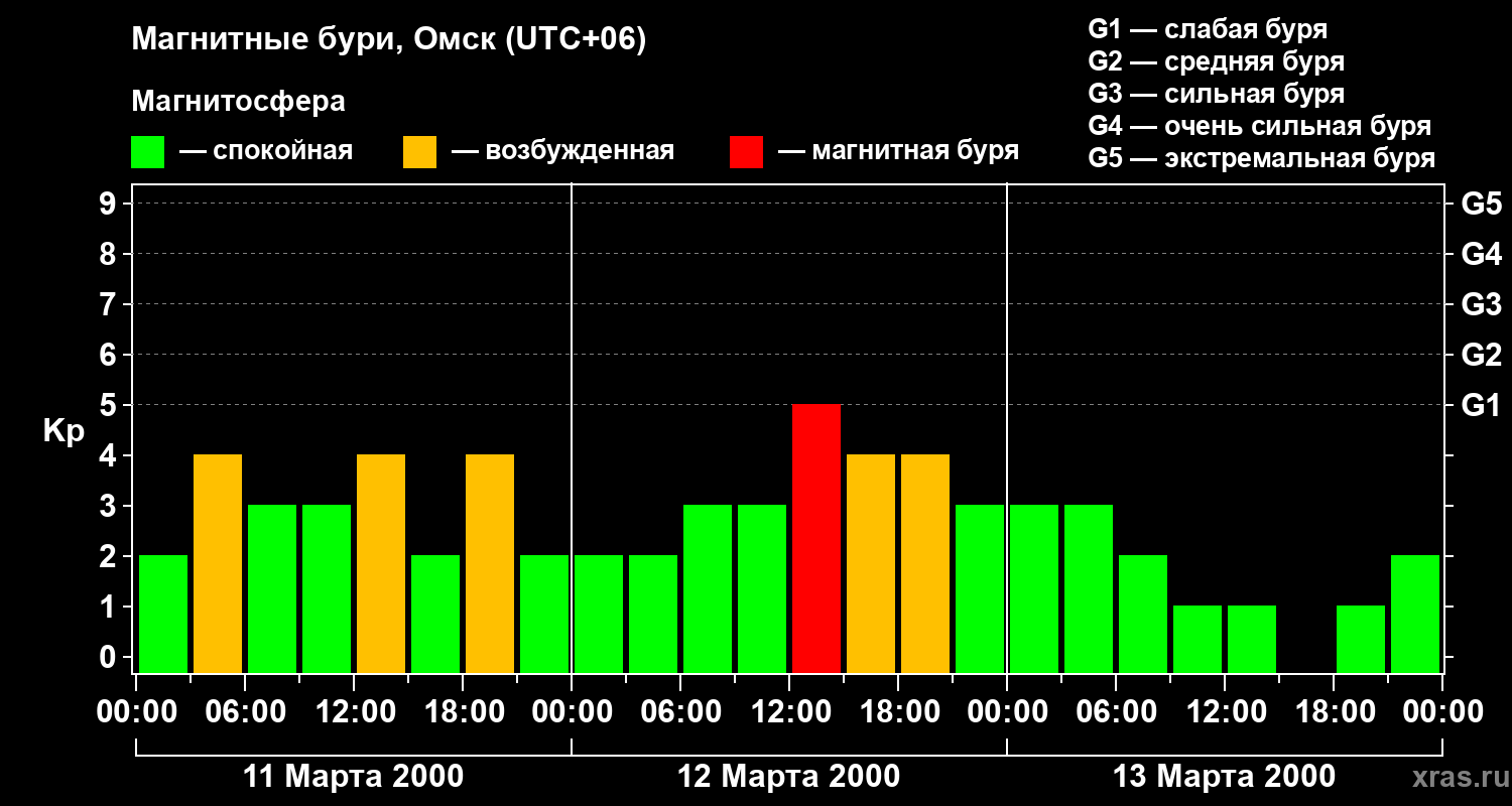 Изменения геомагнитного индекса Kp с 11 по 13 марта 2000 года для средних широт