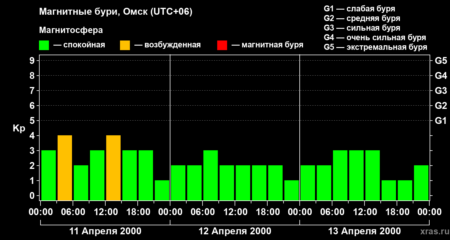 Изменения геомагнитного индекса Kp с 11 по 13 апреля 2000 года для средних широт