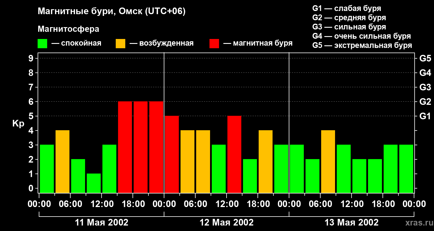Изменения геомагнитного индекса Kp с 11 по 13 мая 2002 года для средних широт