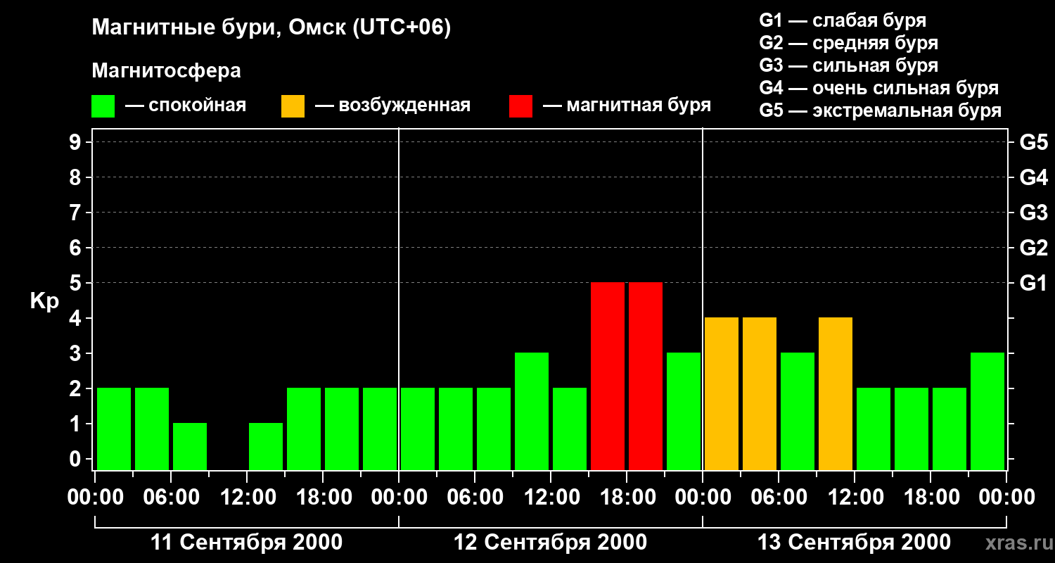 Изменения геомагнитного индекса Kp с 11 по 13 сентября 2000 года для средних широт