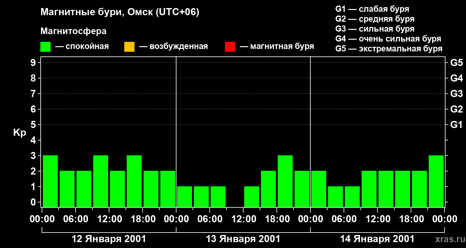 Изменения геомагнитного индекса Kp с 12 по 14 января 2001 года для средних широт