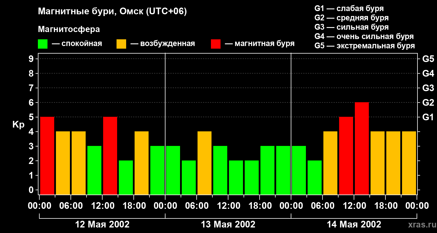 Изменения геомагнитного индекса Kp с 12 по 14 мая 2002 года для средних широт
