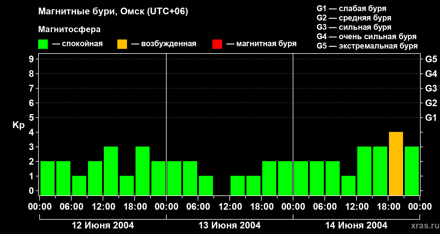 Изменения геомагнитного индекса Kp с 12 по 14 июня 2004 года для средних широт