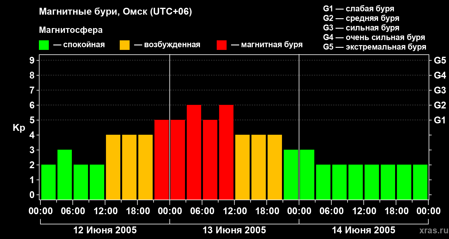 Изменения геомагнитного индекса Kp с 12 по 14 июня 2005 года для средних широт