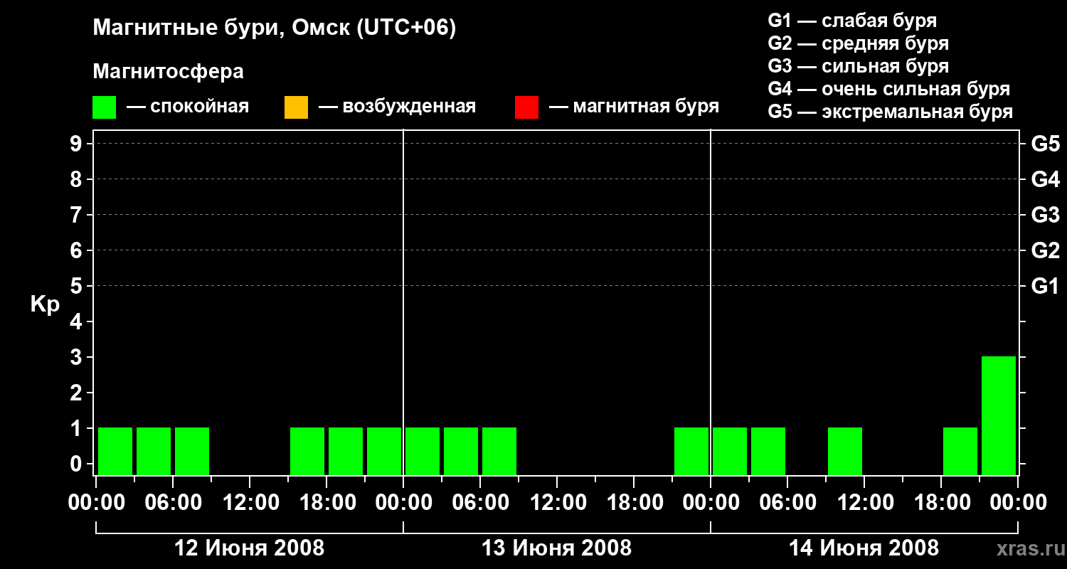 Изменения геомагнитного индекса Kp с 12 по 14 июня 2008 года для средних широт