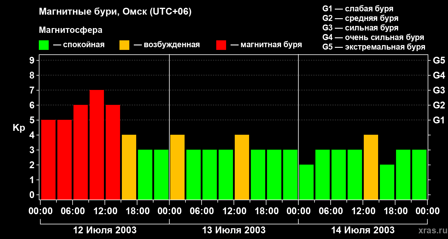 Изменения геомагнитного индекса Kp с 12 по 14 июля 2003 года для средних широт