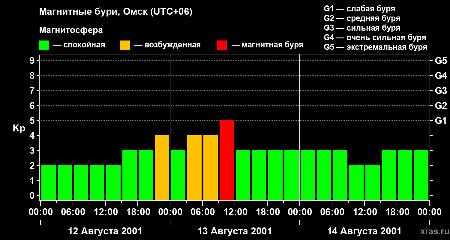 Изменения геомагнитного индекса Kp с 12 по 14 августа 2001 года для средних широт