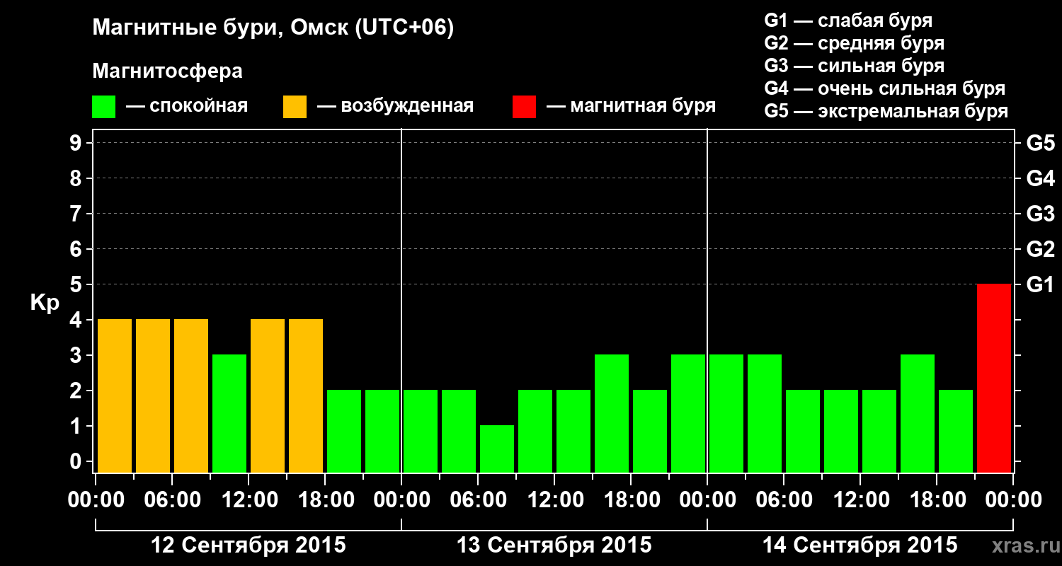 Изменения геомагнитного индекса Kp с 12 по 14 сентября 2015 года для средних широт