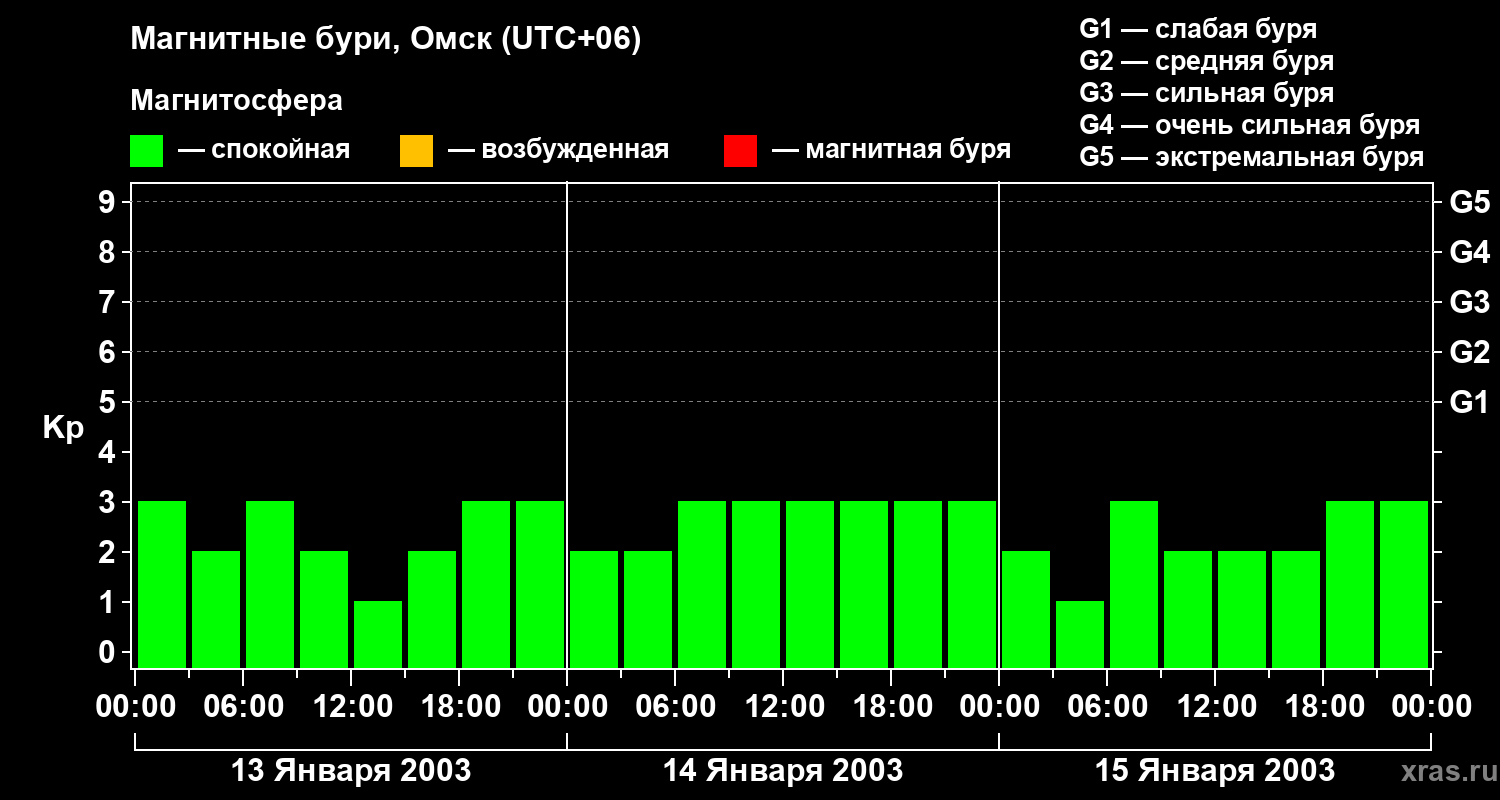 Изменения геомагнитного индекса Kp с 13 по 15 января 2003 года для средних широт