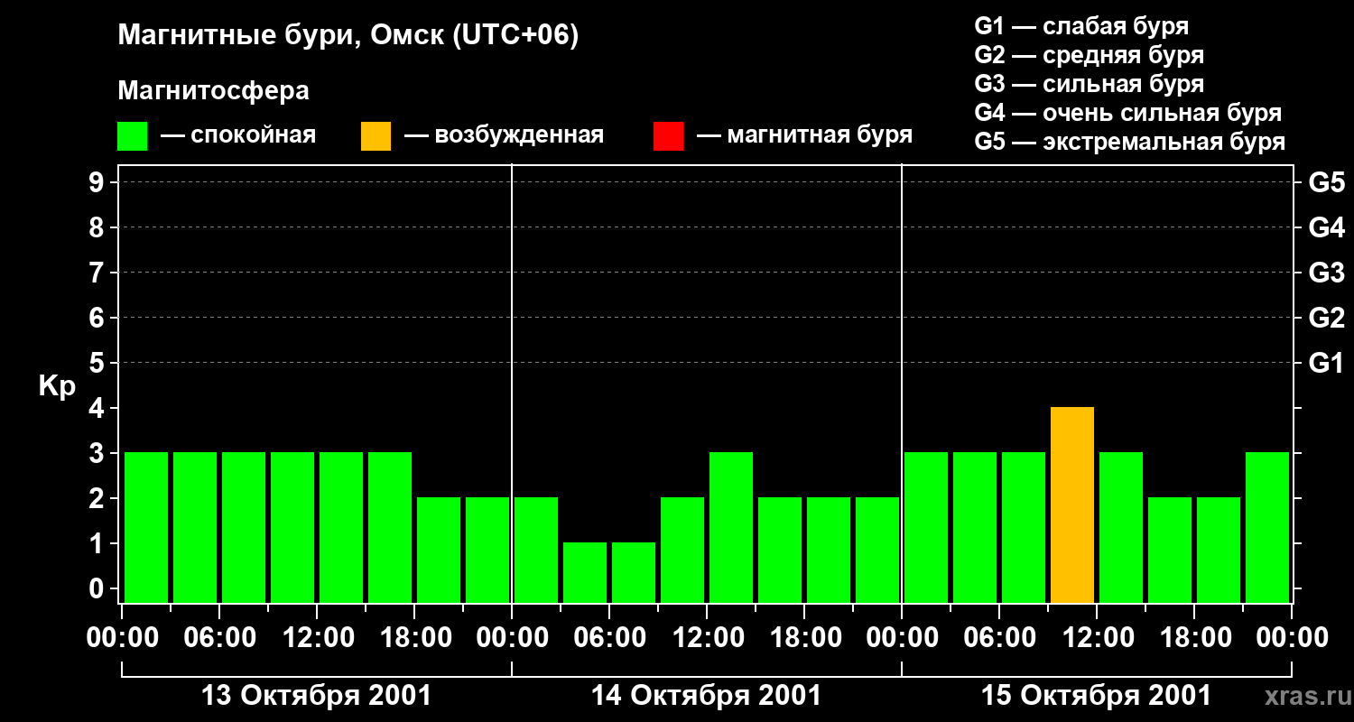 Изменения геомагнитного индекса Kp с 13 по 15 октября 2001 года для средних широт