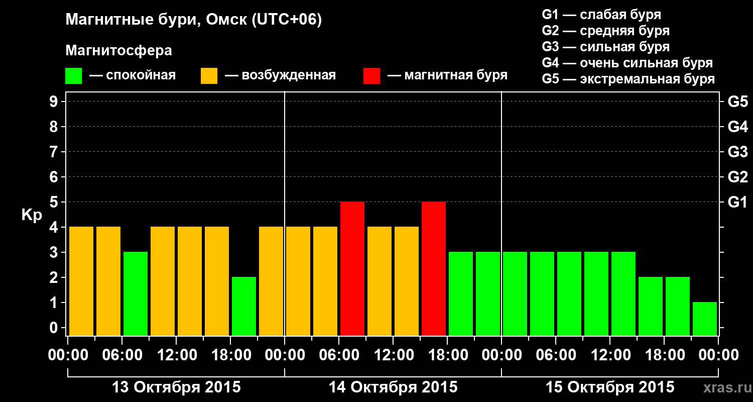 Изменения геомагнитного индекса Kp с 13 по 15 октября 2015 года для средних широт