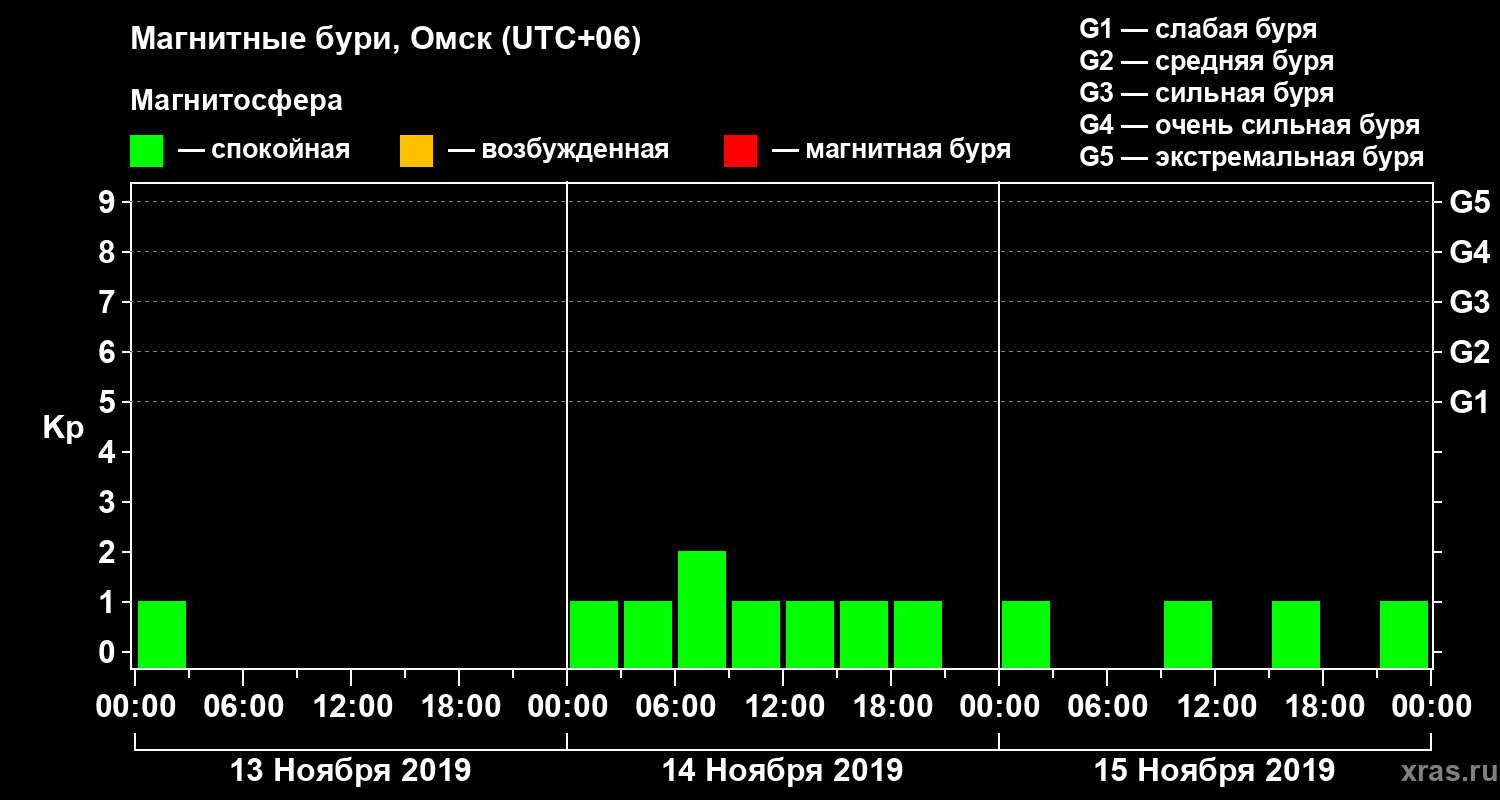 Изменения геомагнитного индекса Kp с 13 по 15 ноября 2019 года для средних широт
