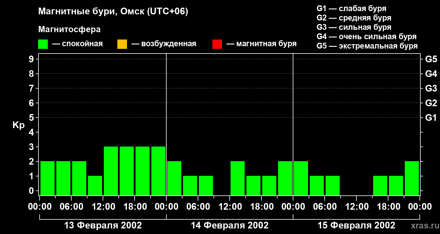 Изменения геомагнитного индекса Kp с 13 по 15 февраля 2002 года для средних широт