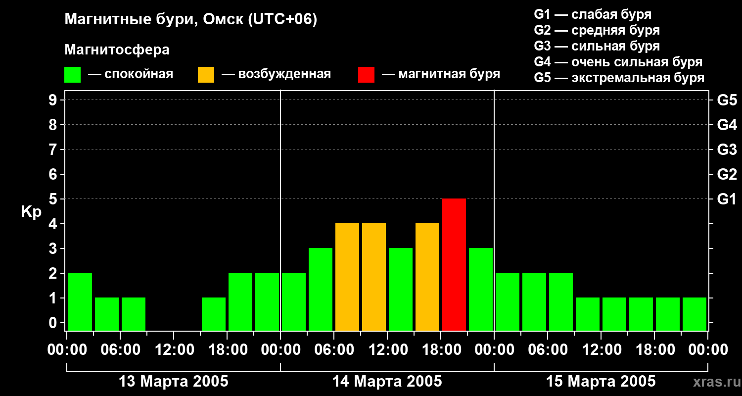Изменения геомагнитного индекса Kp с 13 по 15 марта 2005 года для средних широт