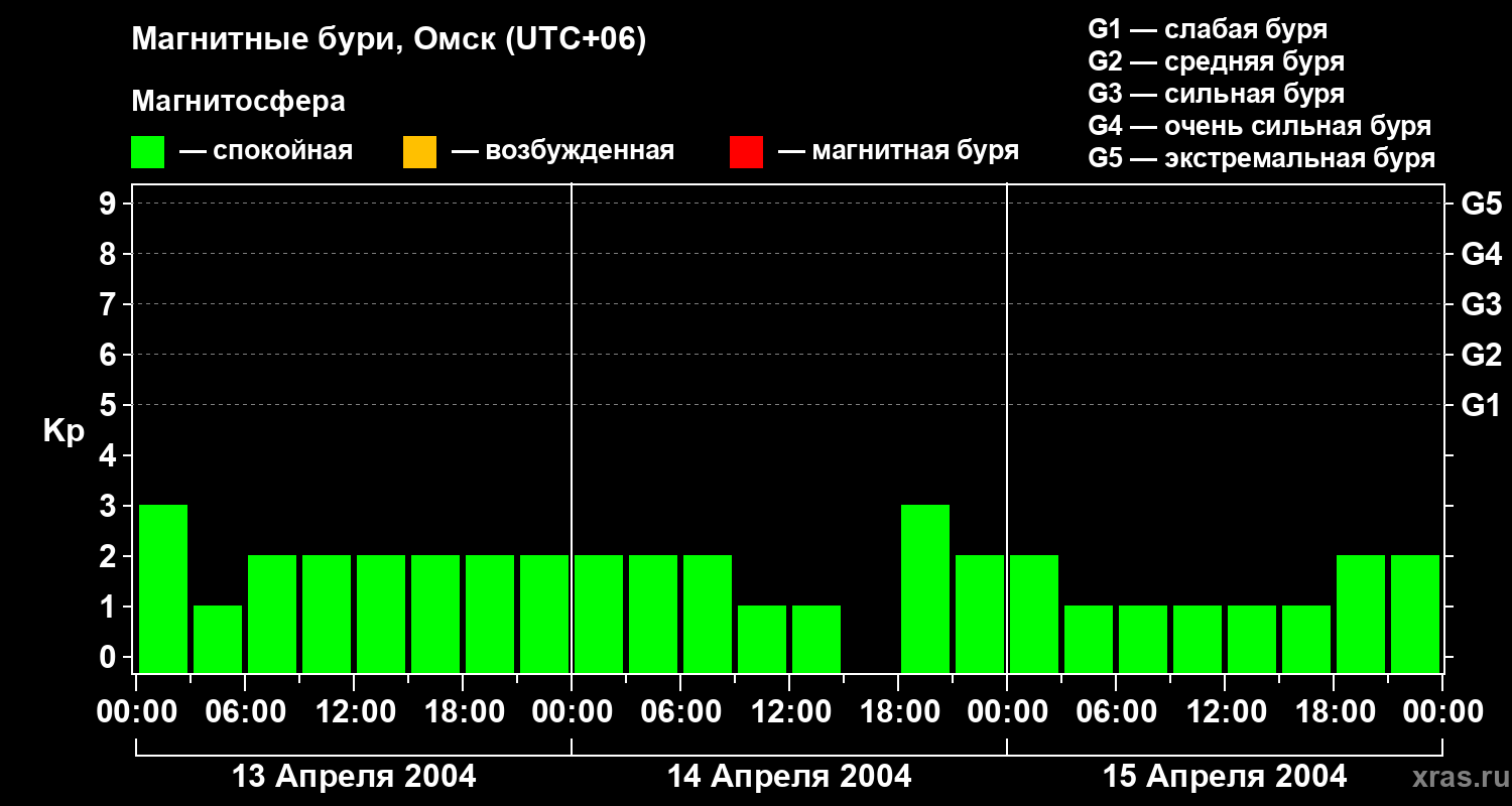 Изменения геомагнитного индекса Kp с 13 по 15 апреля 2004 года для средних широт