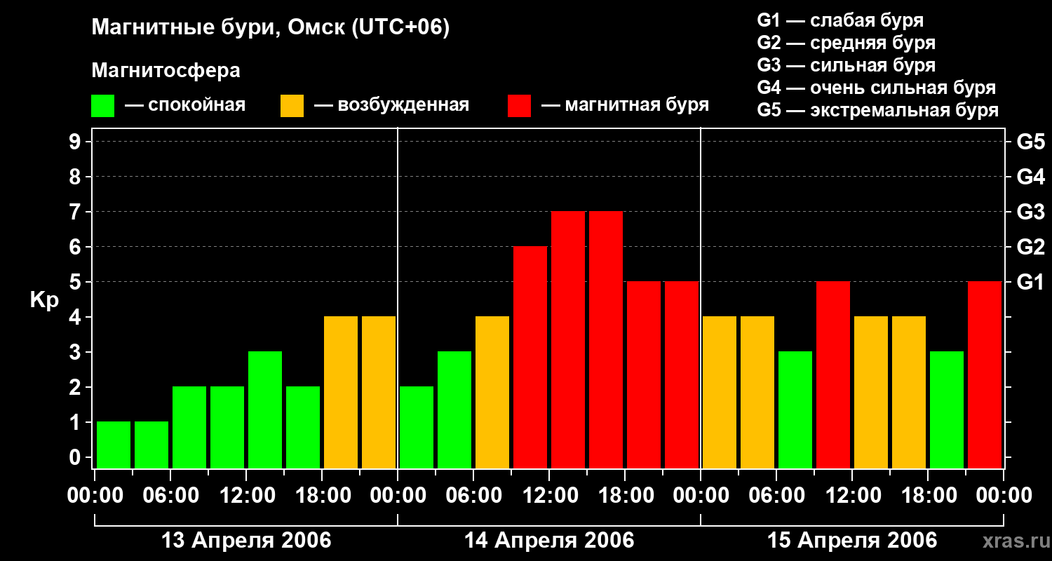 Изменения геомагнитного индекса Kp с 13 по 15 апреля 2006 года для средних широт