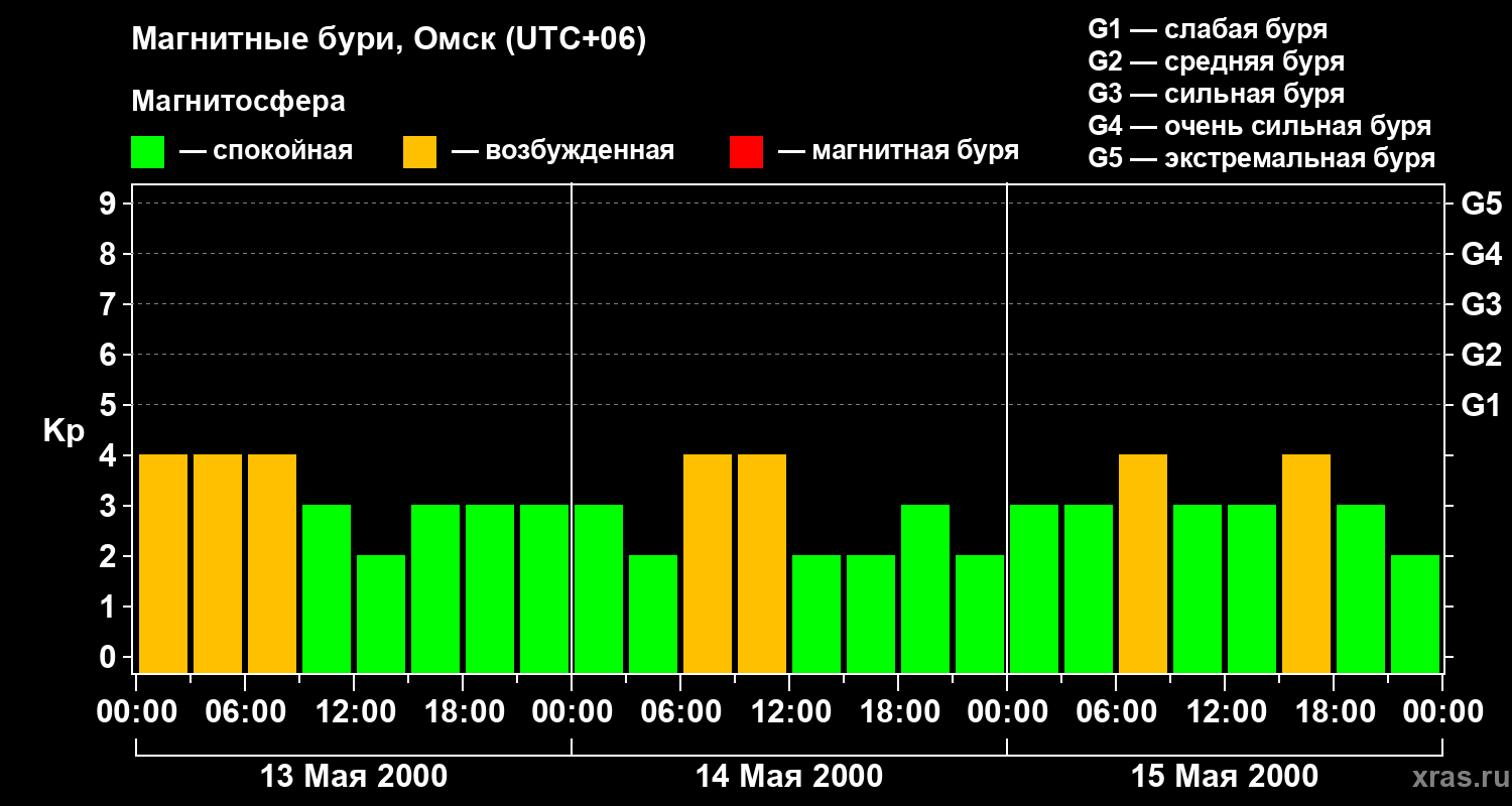 Изменения геомагнитного индекса Kp с 13 по 15 мая 2000 года для средних широт