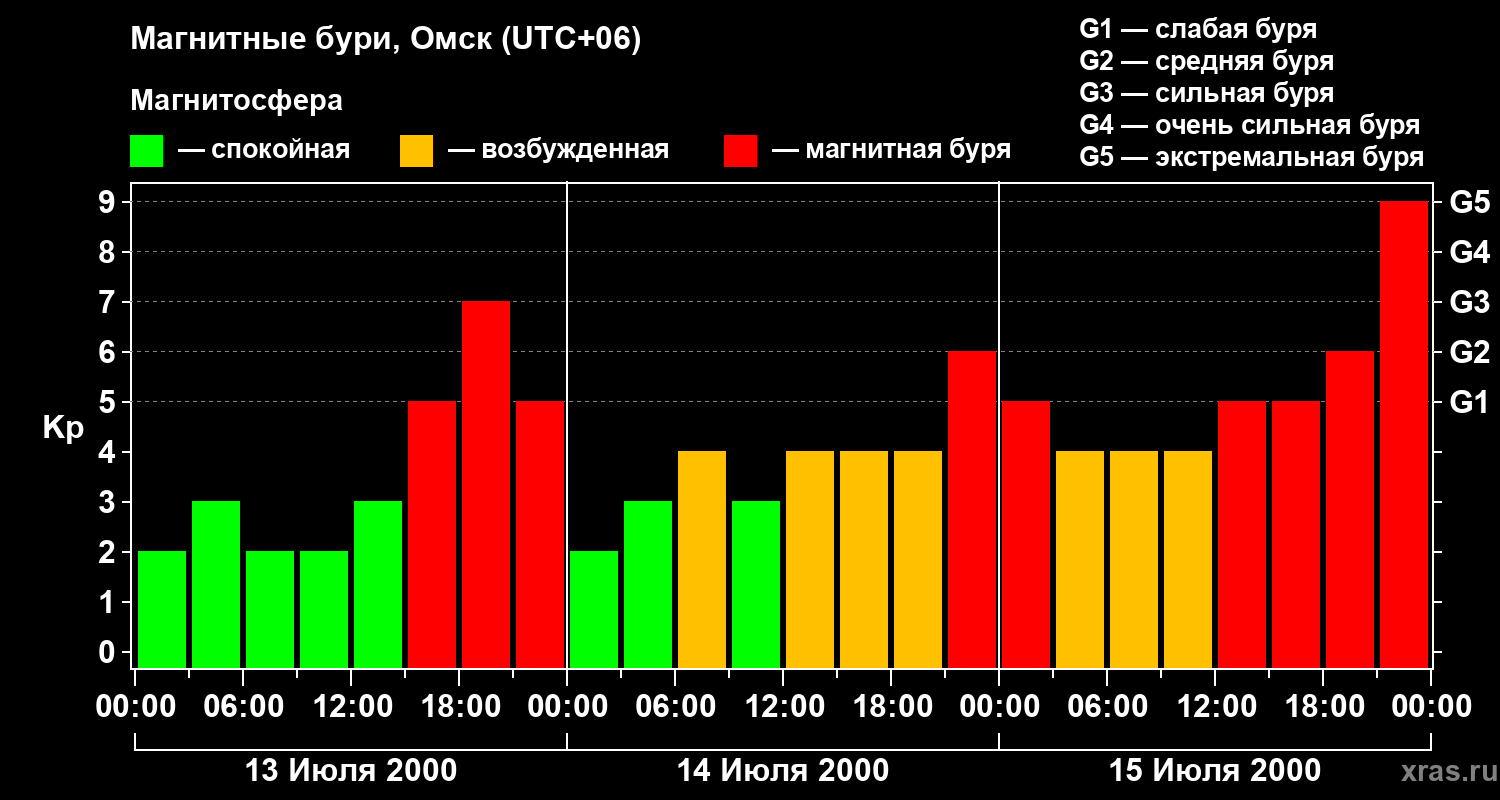 Изменения геомагнитного индекса Kp с 13 по 15 июля 2000 года для средних широт