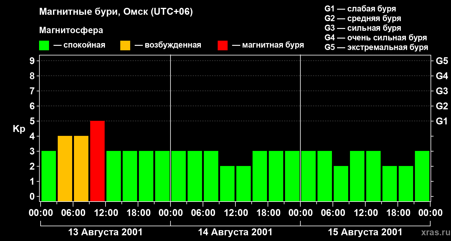 Изменения геомагнитного индекса Kp с 13 по 15 августа 2001 года для средних широт