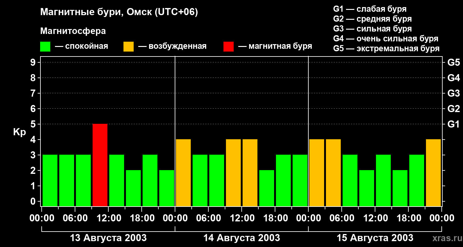 Изменения геомагнитного индекса Kp с 13 по 15 августа 2003 года для средних широт