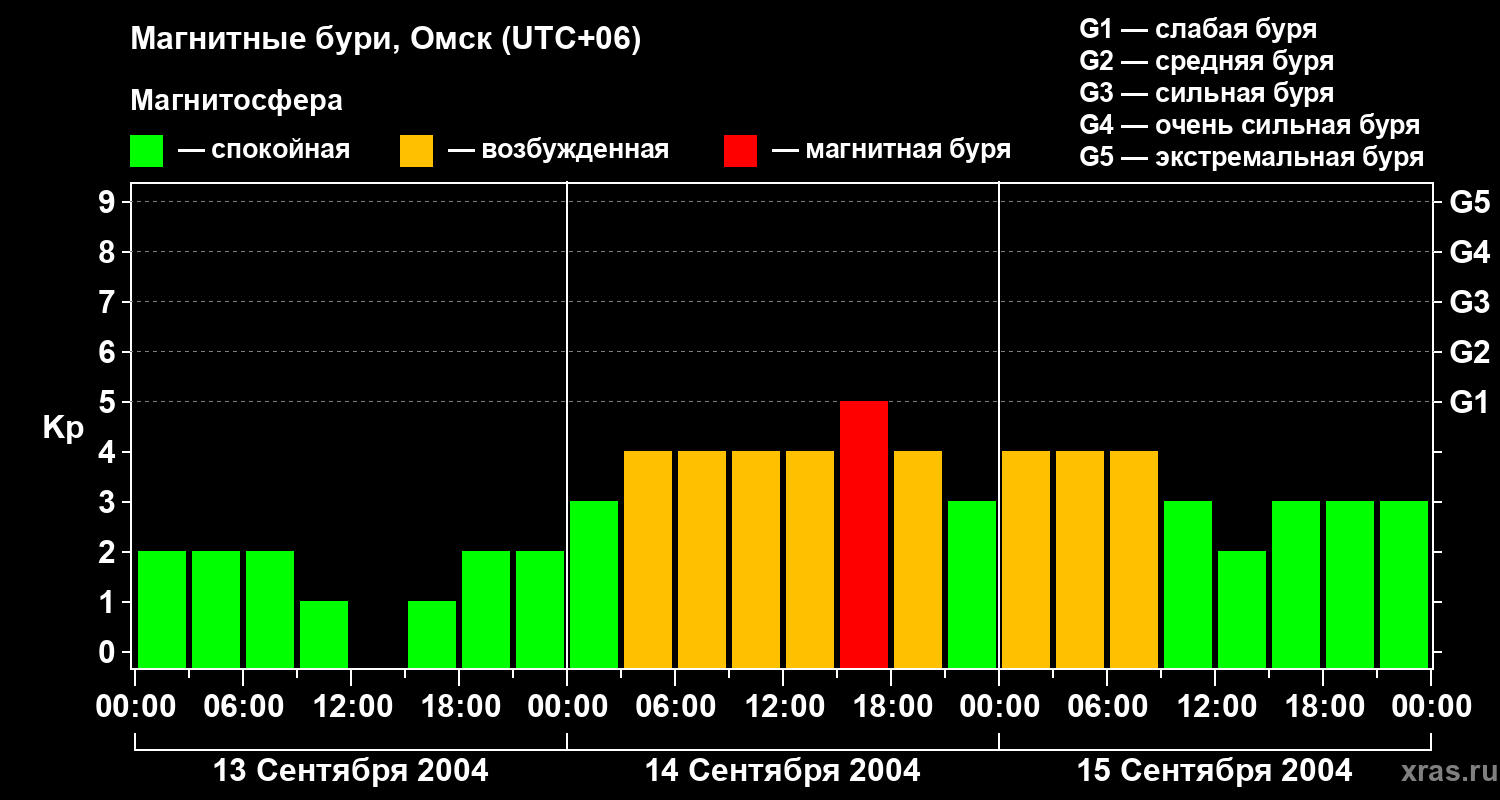 Изменения геомагнитного индекса Kp с 13 по 15 сентября 2004 года для средних широт