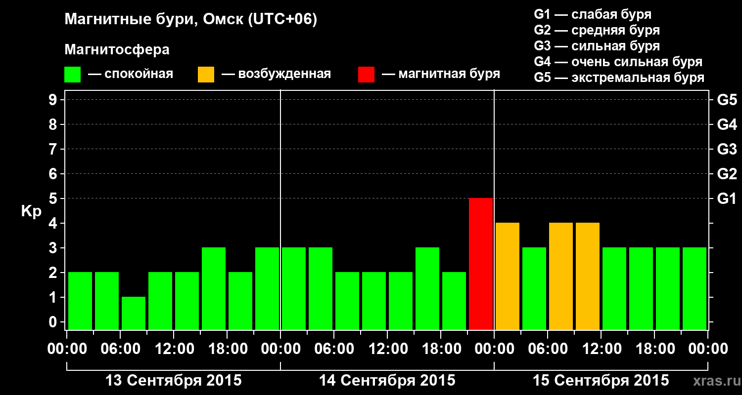 Изменения геомагнитного индекса Kp с 13 по 15 сентября 2015 года для средних широт