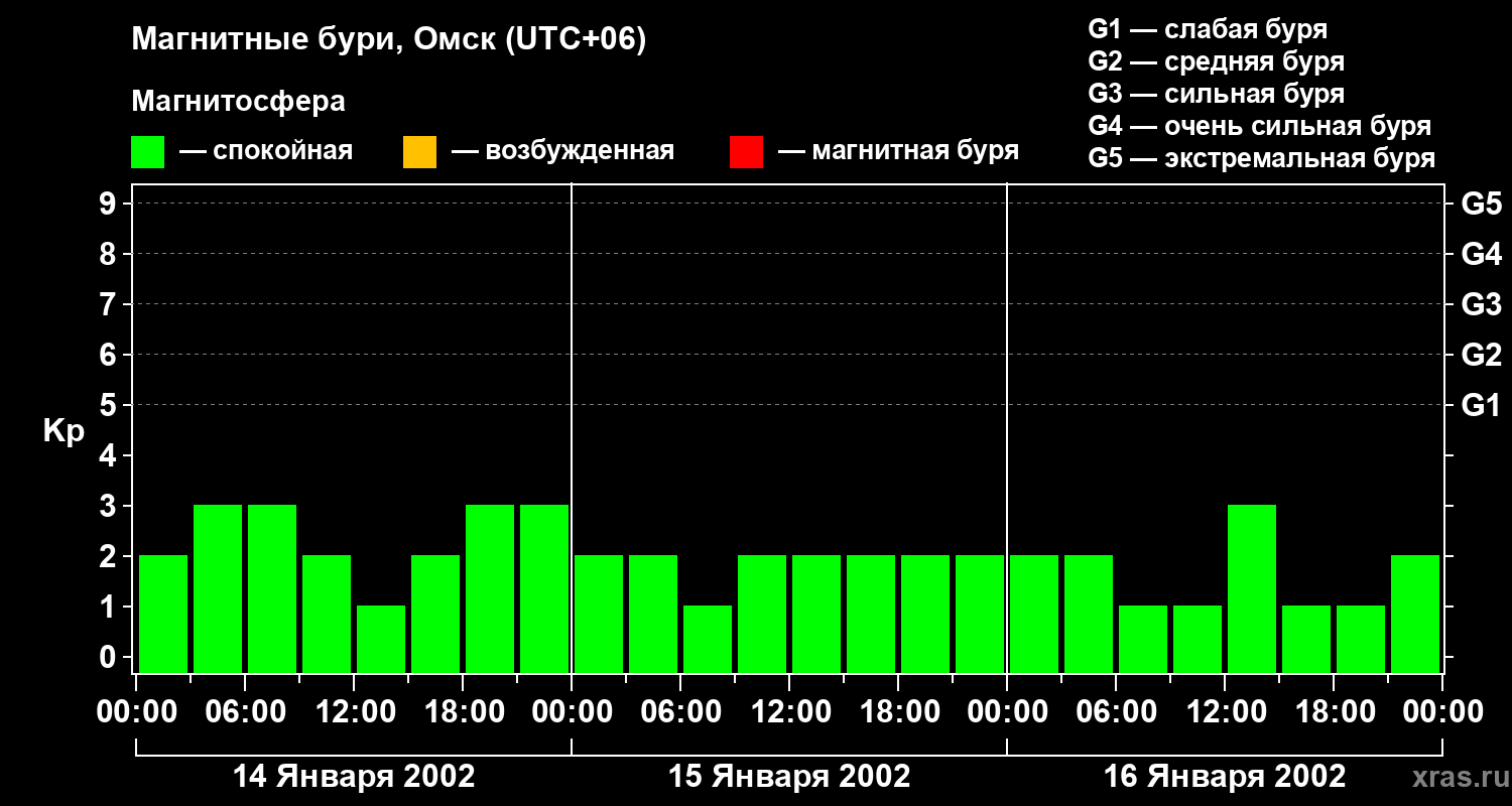 Изменения геомагнитного индекса Kp с 14 по 16 января 2002 года для средних широт