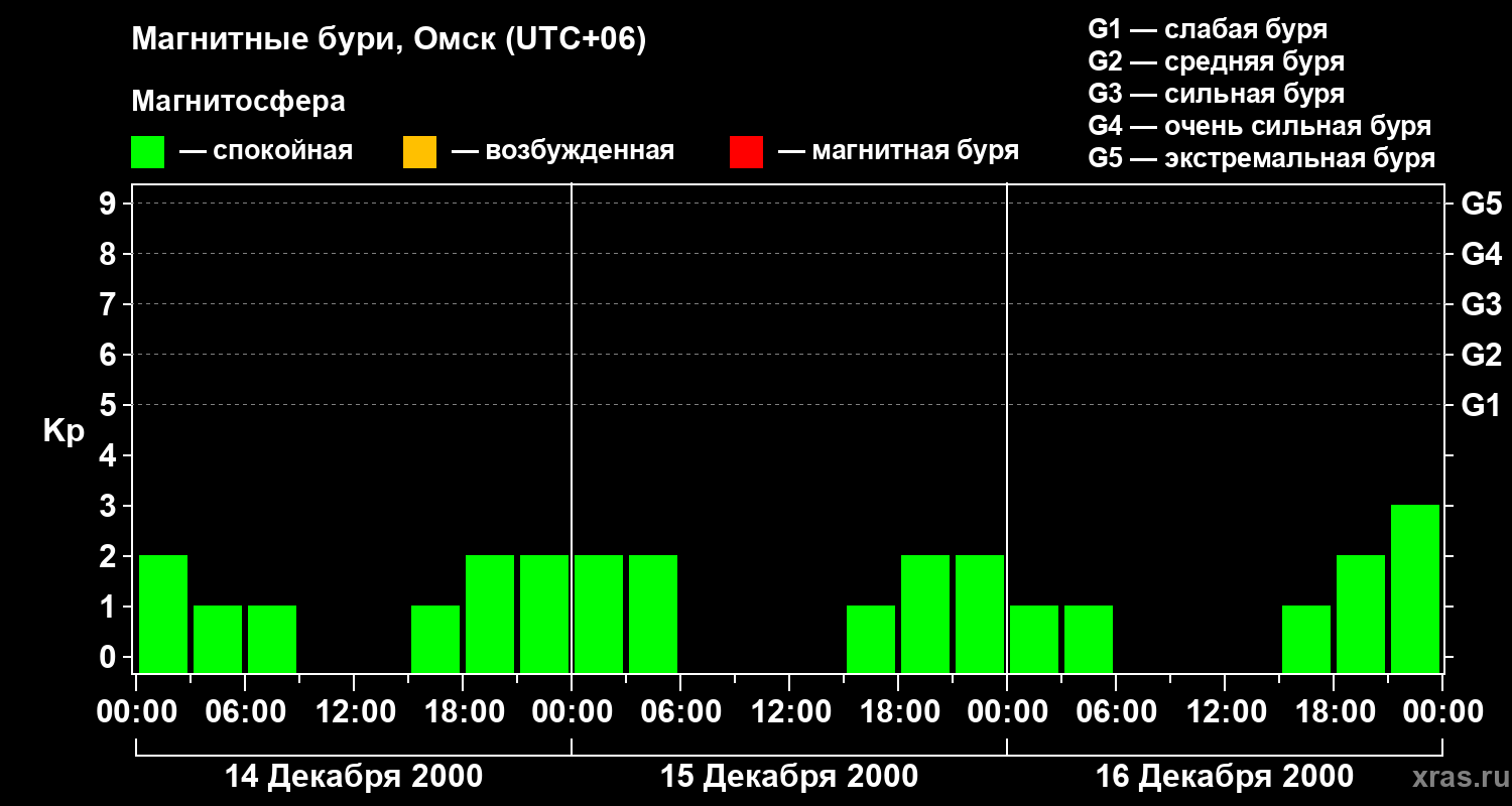 Изменения геомагнитного индекса Kp с 14 по 16 декабря 2000 года для средних широт